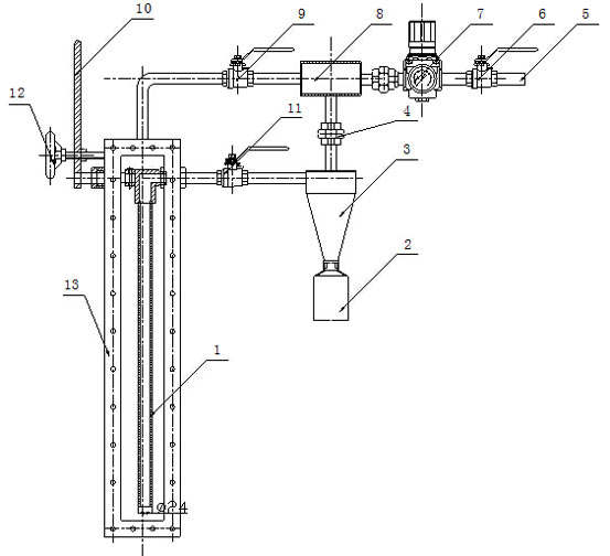 自吸式煤粉取樣器用于直吹式制粉系統(tǒng)一次風(fēng)煤粉管道上定期煤粉取樣,在1000MW、600MW及以下機(jī)組中都有廣泛應(yīng)用。采用壓縮空氣吹掃和用抽氣器抽吸取樣,避免了取樣口堵塞問題的出現(xiàn),且易于取樣。取樣的速度通過控制壓制空氣壓力而得到控制。這樣可以得到較準(zhǔn)確的、具有代表性的、等速的煤粉細(xì)度值。