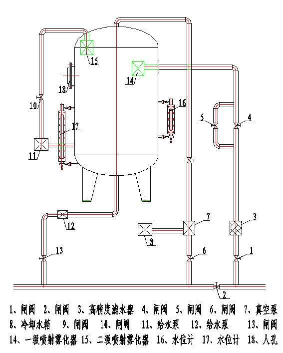 兩級(jí)噴射式真空除氧器(簡(jiǎn)稱(chēng)無(wú)頭除氧器)、由一級(jí)高噴射裝置、二級(jí)噴射裝置, 增壓泵組, 真空泵組,減溫水箱,流量計(jì),汽動(dòng)閥,高精度濾水器,多位閘閥,PLC全自動(dòng)控制箱等組成。