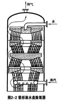 圖2-2所示為一錐形淋水盤(pán)除氧器。水從上部進(jìn)水管進(jìn)人第一層水盤(pán)中央,經(jīng)溢流而沿圓周均布流人淋水盤(pán)內(nèi)。淋水盤(pán)成斜度較小的錐形,由于盤(pán)底的傾斜使淋水孔流出的水成傾斜的細(xì)水流。其優(yōu)點(diǎn)是出力較低時(shí)水位降低,一部分孔無(wú)水,而其余的孔在一定的水位之下仍能形成細(xì)小水柱流出,避免了平底盤(pán)低水量時(shí)不能形成細(xì)小水柱而出現(xiàn)不規(guī)則大水滴的局面,這些水柱仍能保持一定量的傳熱面,使傳熱和脫氧保持了一定效果而不致惡化。但在過(guò)度超負(fù)荷時(shí)與前述淋水盤(pán)一樣水可能會(huì)從邊緣溢出。
