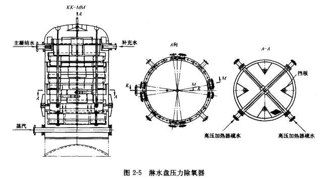 圖2-4所示為一種傳統(tǒng)結(jié)構(gòu)的大氣式除氧器,它由上下兩節(jié)組成以便于拆卸檢修。二者間用大法蘭螺栓連接。