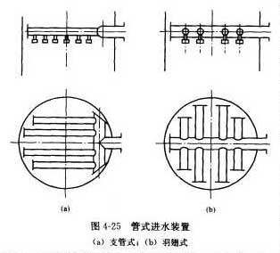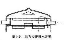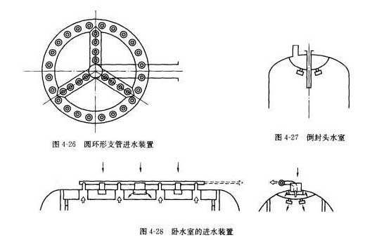 臥式的水室型進水裝置,一般使用一圓弧形長條板,倒扣在筒殼上封頭內(nèi),兩端焊以封板就成水室,如圖4-28所示。太薄的圓弧板會嚴(yán)重變形,甚至因焊(a)支管式1 (b)羽翅式 縫不牢固而造成與上封頭之間的